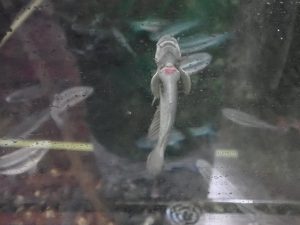 ボウズハゼは川の流れの速い場所に住んでいるハゼの仲間です。下向きに付いた口で石などに付いたコケを食べています。また、この魚のお腹には腹ビレが変化した吸盤が付いていて、流れの速い場所でも流されず、垂直の壁にもくっつくことができます。
