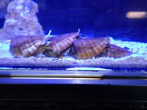 このマガキガイは、砂や壁についたいらない有機物(展示生物の食べ残しやコケなど)を食べてくれるお掃除屋さんなのです。