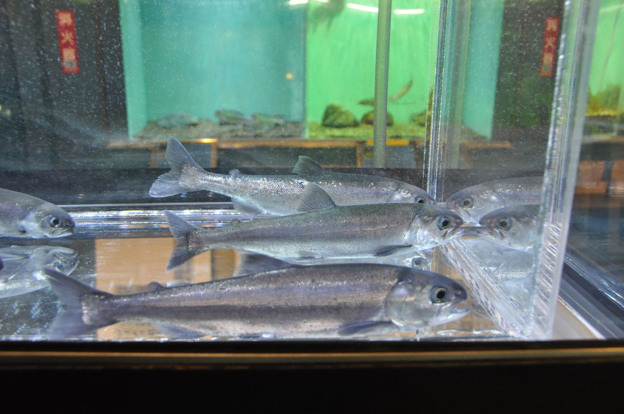 当日は、いつも水族館の外池で泳いでいるチョウザメたちを